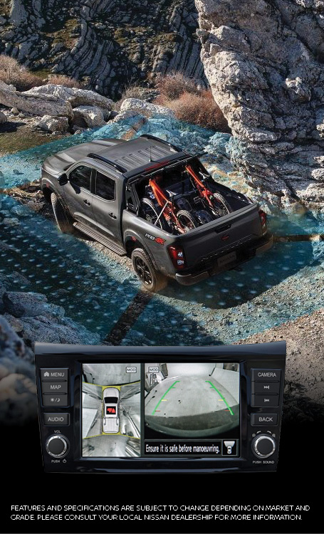 On rough terrain, NAVARA’s Intelligent Around View Monitor becomes your extra set of eyes. With a specialized Off-Road Mode activated at slow speeds in 4 LO mode, this advanced driver technology gives you a crystal clear view of the surrounding terrain as you navigate confidently and boldly across any surface type.